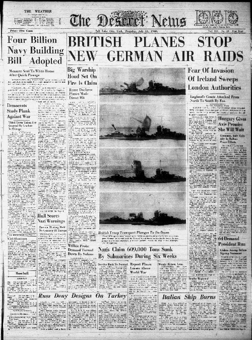 Newspaper Report Mentioning the Invasion of UK (1940) by Nazi Germany’s Fighter Planes [Image Credit: Deseret News]